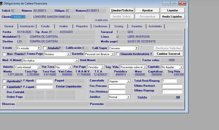 Listado de Formatos F007 SOLICITUD PARA CONSTITUCION DE CDAT EditarNo. FormularioFechaEstadoCorreoEmpresaNombreCédulaDirecciónCiudadTeléfonoMonto SolicitadoPlazoObservacionesFirmaArchivo CédulaVisto BuenoNotas176354917212025-11-19Aprobadoinsyse@hotmail.comwhuLeonardo321321sadg dsfg sduihBogota354654648$15.000.00036Estas son las observaciones del fegoccidenteEste es el Visto bueno realizado por Pepito PerezEstas son las notas